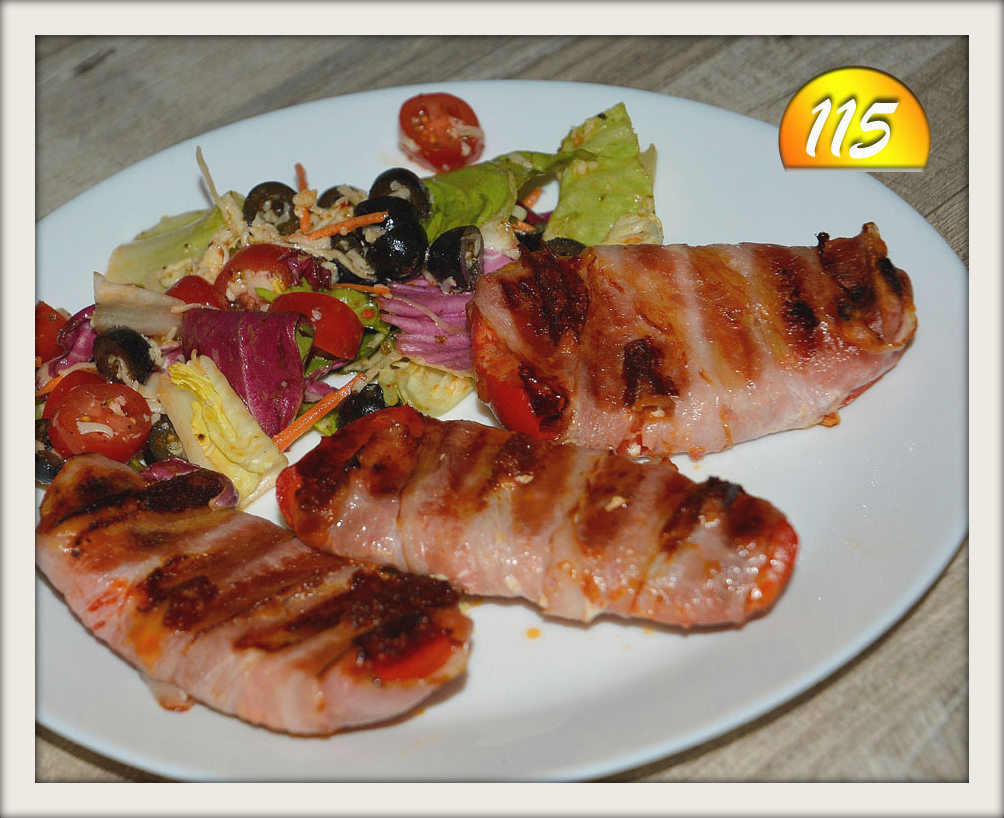 Papryki przekrój wzdłuż, usuń gniazda nasienne i każdą połówkę przekrój na 2-3 części (zależnie od wielkości). Każdy kawałek papryki owiń plastrem boczku. Następnie opiecz je na grillu węglowym lub elektrycznym. Można je również obsmażyć na patelni lub podpiec w piekarniku piekąc przez około 20 minut w temp. 200 stopni.